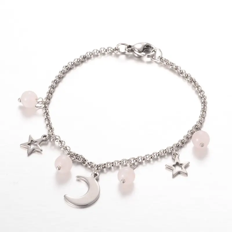 Pulsera con dijes, piedras de cuarzo rosa y cierre